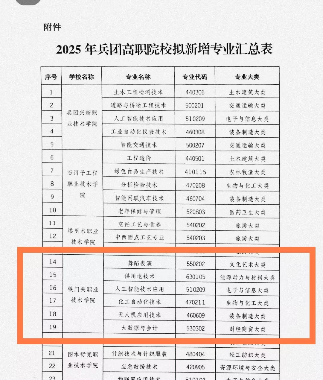 2024年12月31日新疆生产建设兵团教育局发文公布了2025年度兵团高职院校拟新增专业结果,beat365官方网站申请增设的舞蹈表演、供用电技术、人工智能技术应用、化工自动化技术、无人机应用技术、大数据与会计等6个专业获得批准。