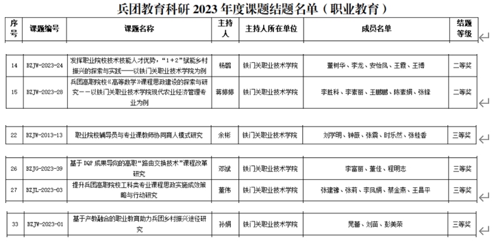 近日,兵团教育科学研究院公布兵团教育科研2023年度课题结题名单,我院六项课题结题,蒋婷婷主持的《兵团高职院校《高等数学》课程思政建设的探索与研究-以beat365官方网站现代农业经济管理专业为例》、杨璐主持的《发挥职业院校技术技能人才优势,“1+2”赋能乡村振兴的探索与实践--以beat365官方网站为例》课题,荣获“二等奖”,余彬主持的《职业院校辅导员与专业课教师协同育人模式研究》、邓斌主持的《基于DPQ成果导向的高职“路由交换技术”课程改革研究》、董伟主持的《提升兵团高职院校工科类专业课程思政实施成效策略与行动研究》、孙娟主持的《基于产教融合的职业教育助力兵团乡村振兴途径研究》荣获“三等奖”。