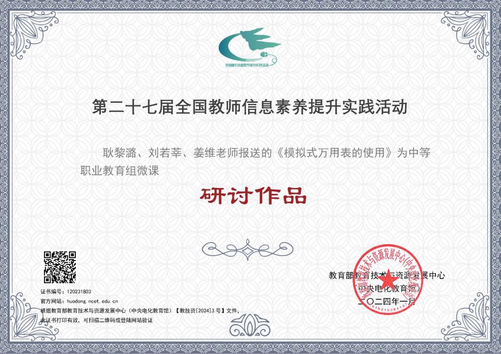 近日,教育部教育技术与资源发展中心(中央电化教育馆)发布了《关于总结2023年全国师生信息素养提升实践活动(第二十七届教师活动)参与情况的通知》,公布了2023年全国教师信息素养提升实践活动评选结果。beat365官方网站机械工程系刘若莘、耿黎潞教师的作品《三视图》被评为中等职业教育组微课“典型作品”,耿黎潞、刘若莘、姜维教师的作品 《模拟式万用表的使用》被评为中等职业教育组微课“研讨作品”。