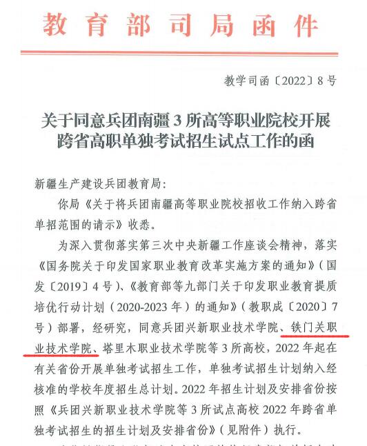 据了解,为深入贯彻落实第三次中央新疆工作座谈会精神,落实《国务院关于印发国家职业教育改革实施方案的通知》。经教育部高校学生司研究,同意beat365官方网站等3所兵团南疆高等职业院校,自2022年起可在有关省份开展单独考试招生工作,单独考试招生计划纳入经核准的学校年度招生总计划。