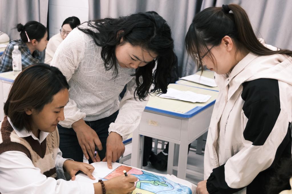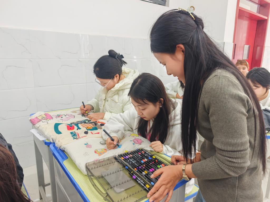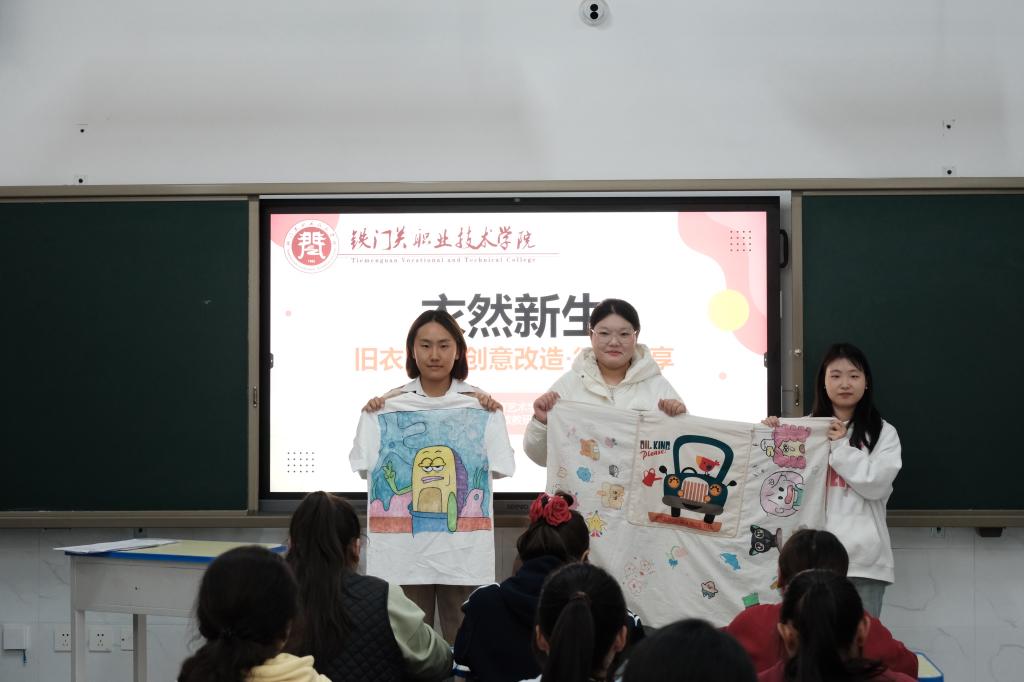 过程中,老师们不仅向同学们讲解旧物新用对于环保的重要意义,还结合早期教育专业的手工教学经验,指导大家掌握基础缝制、图案排版技巧,鼓励大家大胆表达创作想法,真正实现 “手脑并用”。从构思设计到动手绘制、缝制,同学们全程投入,在实践中感受创意的魅力与环保的价值。最终,一件件原本可能被丢弃的旧衣,在同学们手中摇身一变,成为了独具个人风格的穿搭单品,让旧衣物以“穿在身上的创意”重新回归生活。