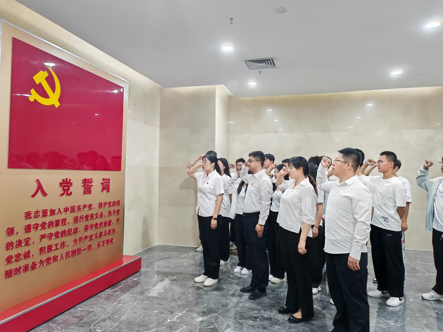 活动伊始,党员们在宣誓人的带领下,面对鲜红的党旗和庄严的誓词,高举右拳,重温入党誓词。通过铿锵有力的宣誓警醒自己,不忘初心,继续前进。