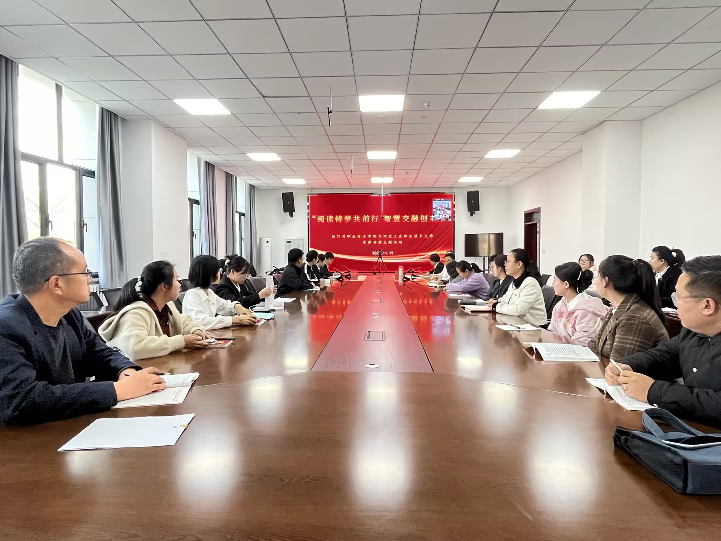 为深化党建引领,强化交流合作,促进优势互补,构建“资源共享、互相促进、共同发展”的党建共建联建新格局,11月19日,beat365官方网站教学科研党支部、公共基础学院党支部联合河北工业职业技术大学信息中心直属党支部、基础课教学部教师党支部联合开展以“阅读铸梦共前行,智慧交融创未来”为主题的党建共建活动,两校共计36名党员、入党积极分子参加此次活动。