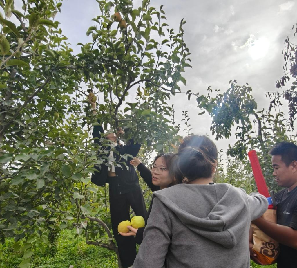 随后,果农为党员们现场讲解并演示了香梨采摘的技术要领,强调“轻拿轻放、采大留小、去瑕留优”原则,确保果实完整、不影响销售。党员们随后分组投入采收工作,有序完成采摘、分拣、包装、装箱等流程,严格把控果品质量,提升采收效率。此外,部分党员还通过现场购买、社交媒体推广等方式,积极帮助农户拓展香梨销售渠道。