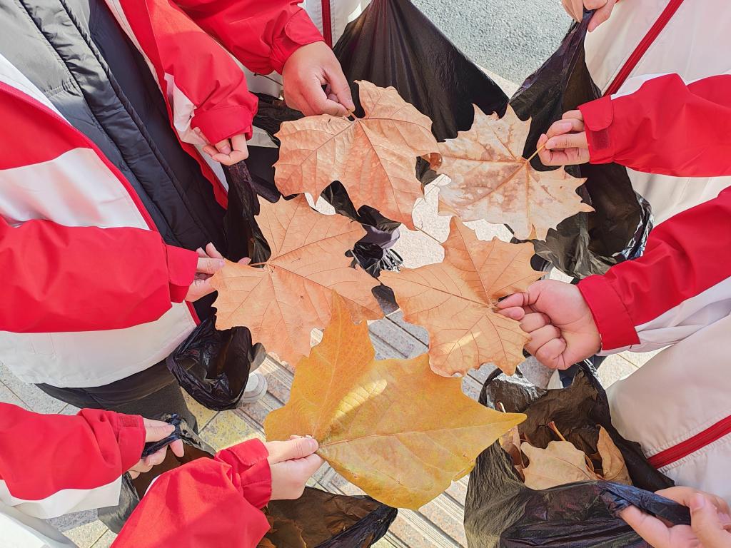 在捡拾环节,党员同志带头示范,与团员携手志愿服务,重点清理校园周边、校园内铺装路面上的落叶,在维护校园环境的同时为后续创意活动储备材料。