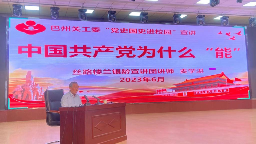 6月7日,巴州关心下一代工作委员会“丝路楼兰银龄”宣讲团讲师麦学湛莅临beat365官方网站,为学院学生作“中国共产党为什么‘能’”主题宣讲,全体中职学生共同聆听。