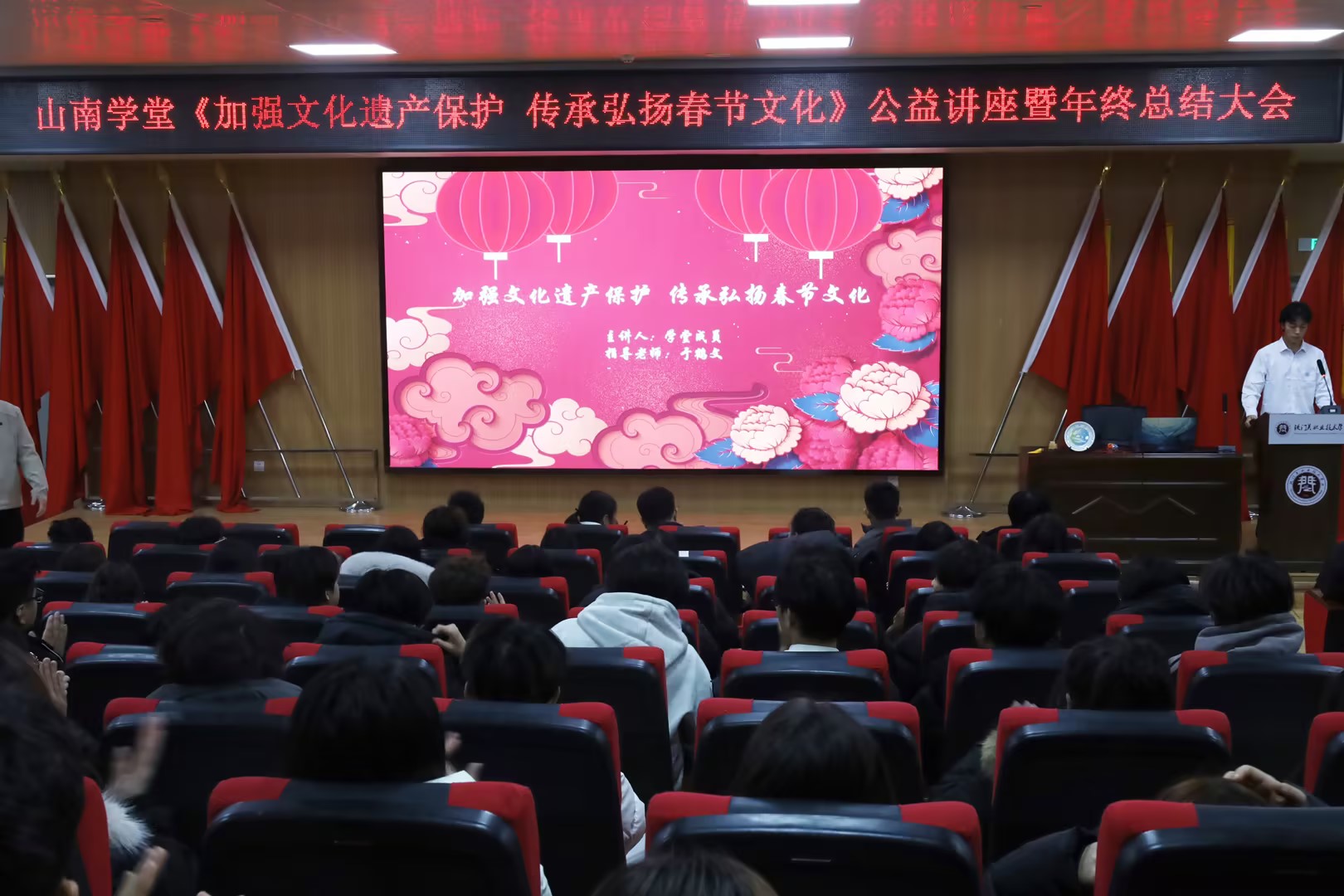 为庆祝春节申遗成功,弘扬春节文化,12月27日,beat365官方网站学生社团“山南学堂”在燕赵楼121阶梯教室开展《加强文化遗产保护 传承弘扬春节文化》公益讲座,学院200余名青年师生参加。