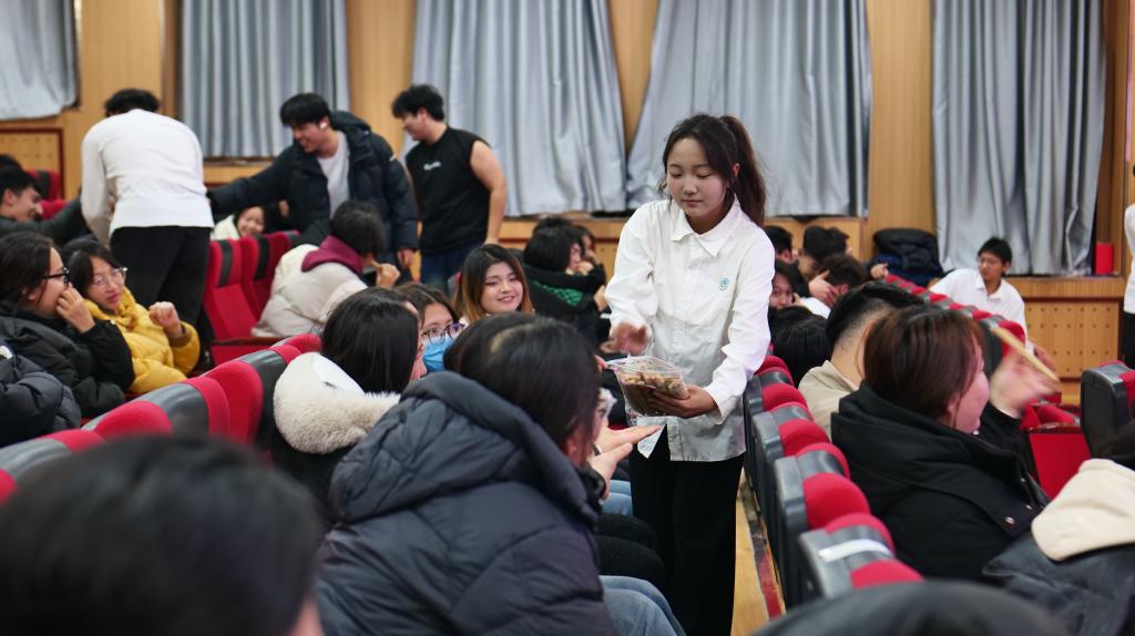会场气氛热烈,社团成员们拜早年、发灶糖,台上台下积极互动,各位同学争相分享自己家乡的春节习俗、美食等,活动尾声,同学们踊跃参加“爆竹传声响 年夜飘饭香”年俗探寻活动,相约来年共享共学。