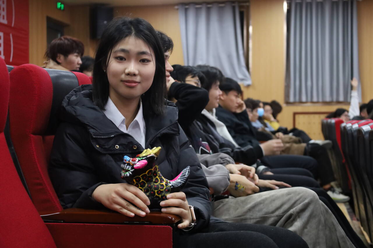 讲座现场气氛欢快热烈,同学们认真聆听的同时,还纷纷与老师互动交流,在得知有位听众同学恰逢生日时,于老师将自己展示的家乡民俗产品“泥泥狗”作为生日礼物赠送给她,并送上了生日祝福,经久不息的掌声尽显浓浓师生情。