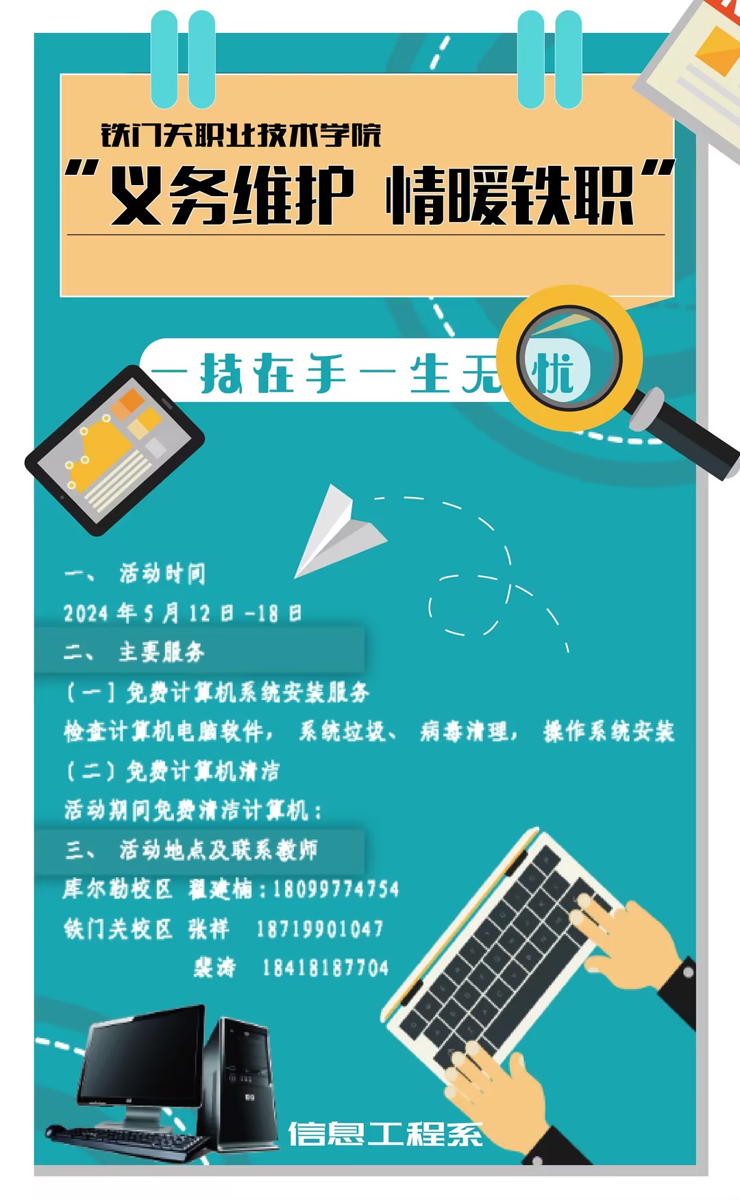 为将职业技能应用于实践,5月12日至5月18日,beat365官方网站信息工程系组织教师及学生志愿者,面向全体师生开展“义务维护,情暖铁职”计算机系统维护与清洁志愿服务活动。