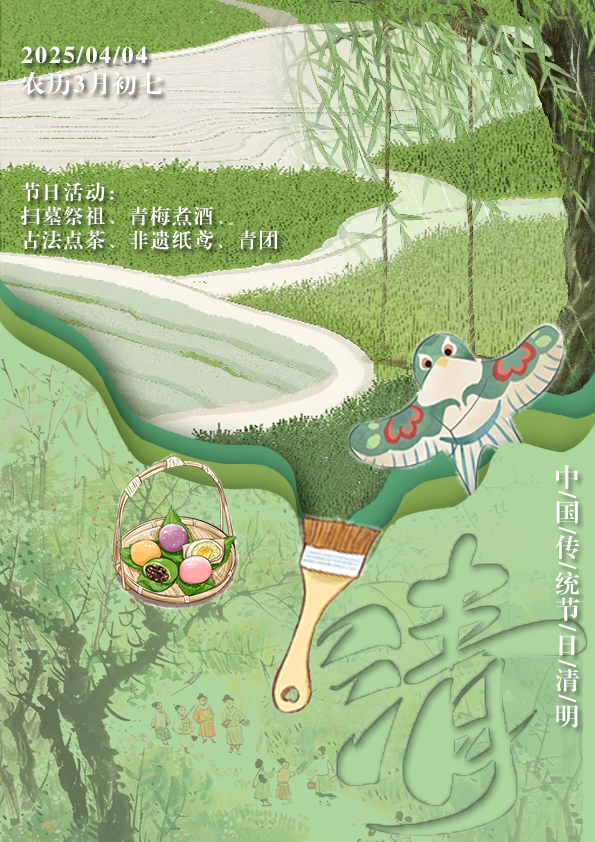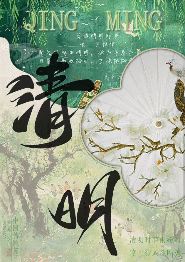 课程采取“文化解析+技术实践”的教学模式。教师通过多媒体资料系统讲解清明节“祭扫追思”与“春耕踏青”的文化内涵,并结合专业课程特点,对海报设计的构图原理、色彩搭配及图片处理技巧进行示范讲解。在实践环节,学生运用Photoshop软件进行创作,将柳枝、纸鸢等传统文化符号与现代设计语言相结合,通过冷暖色调对比、视觉层次构建等手法,呈现清明节特有的文化意蕴。