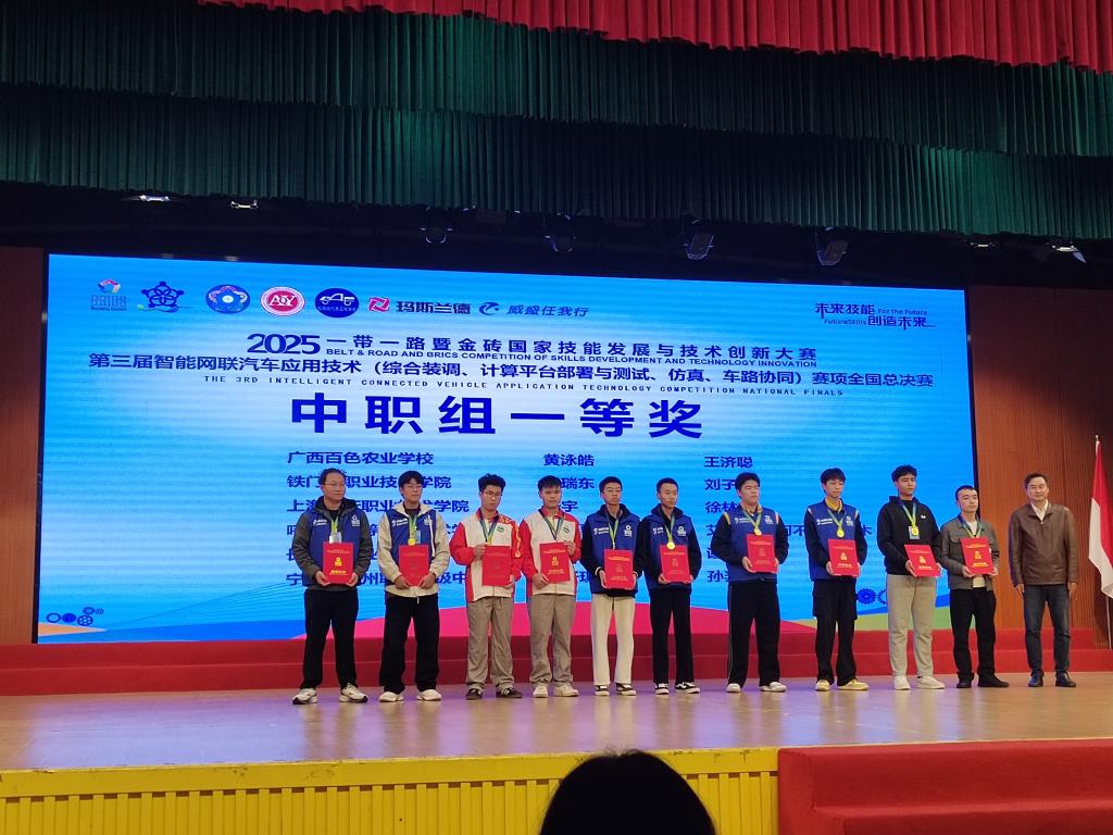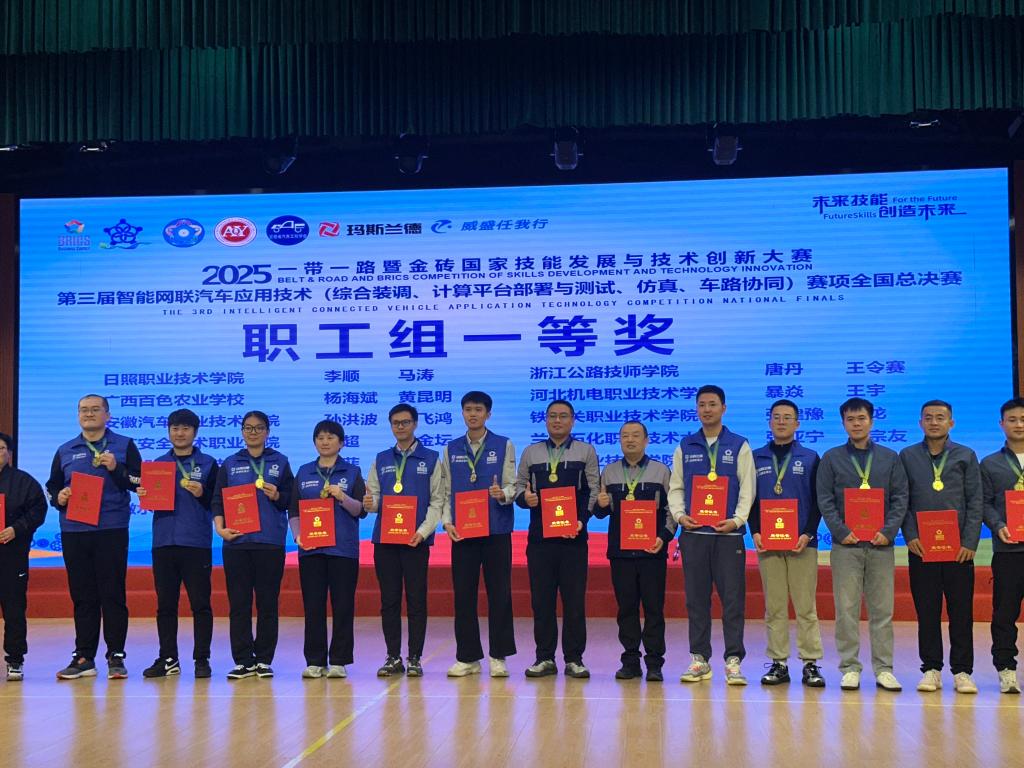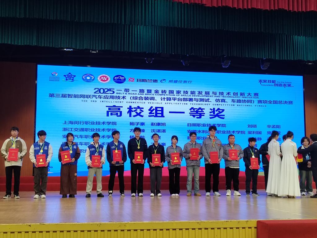 11月9日,2025一带一路暨金砖国家技能发展与技术创新大赛第三届智能网联汽车应用技术全国总决赛在安徽汽车职业技术学院落幕。beat365官方网站汽车与智能交通学院参赛团队表现出色,分获职工组(张建豫、金龙)、高校组(23级新能源汽车检测与维修技术1班何俊、王云赛)、中职组(24级汽车运用与维修1班刘子强、戚瑞东)三项一等奖,展现了学院在智能网联汽车技术领域的教学实力与人才培养成效。