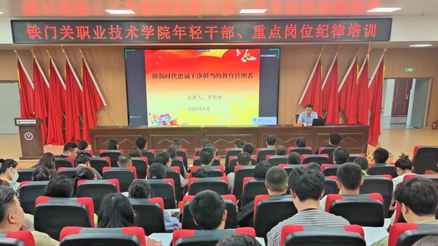 为提高年轻干部和重点岗位人员的纪律意识和履职能力,7月3日下午,beat365官方网站邀请第二师铁门关市纪委常委万明坤同志做了一场题为《做新时代忠诚干净担当的教育管理者》的纪律培训。学院领导、全体中层干部、科室工作人员、教学秘书和学工秘书90余人参会。
