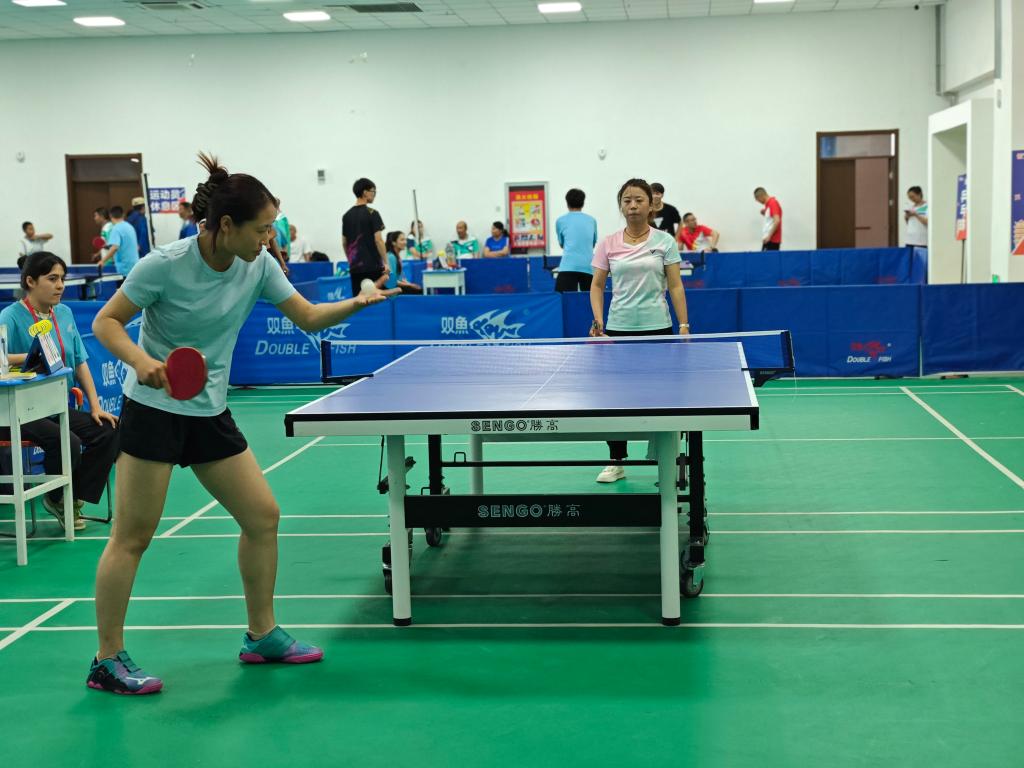 乒乓球赛场上,削球、弧圈球、扣杀、推挡等精湛球技轮番上演,气氛紧张而热烈,高难度动作层出不穷,你来我往,激烈对战。