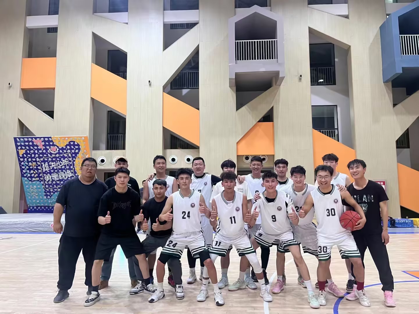 4月20日,第二师铁门关市举办的2024年“工会杯”兵地融合男子业余篮球联赛激情开赛,我校篮球代表队领队吴沁林,教练员付聪带领12名篮球队员前往铁门关市第二中学参加比赛。