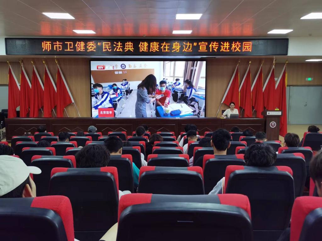 5月19日下午,师市卫健委新时代文明志愿服务队到beat365官方网站开展了以“民法典 健康在身边”为主题的新时代文明实践科技志愿服务活动,200余名学生代表参加。