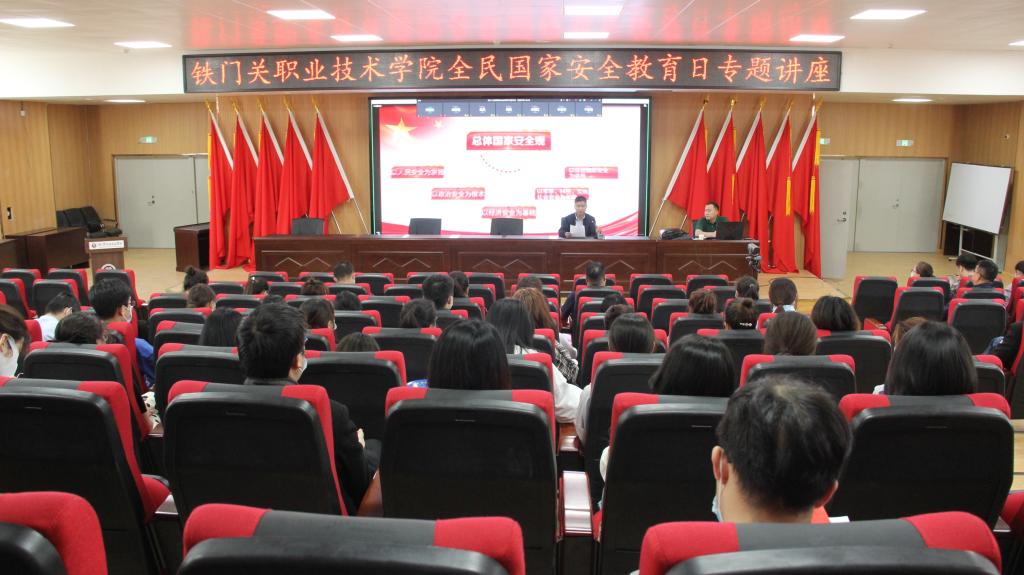 beat365官方网站积极组织师生开展“全民国家安全教育日”系列宣传活动,特别邀请上级相关部门工作人员来学院作专题讲座,全体教职工参加,铁门关铁门关校区、库尔勒校区4000余名学生通过在线课堂同步收看。学院还通过主题班会、专题思政课、投放国家安全宣传标语、播放宣传片等多种形式为师生普及国家安全相关知识,进一步提高师生国家安全意识,营造了维护国家安全的浓厚氛围。