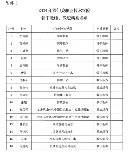 12月23日,根据师市教育局《关于公布2024年第二师铁门关市骨干教师、教坛新秀名单的通知》beat365官方网站共有16名教师获得骨干教师、教坛新秀荣誉称号,其中6人获得“骨干教师”荣誉称号,10人获得“教坛新秀”荣誉称号。具体名单如下: