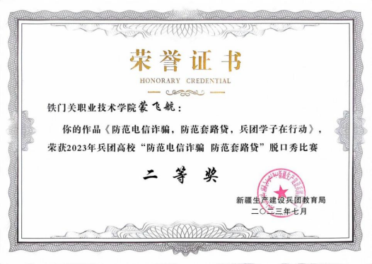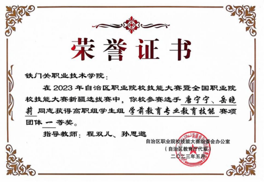 唐宁宁作为新时代的大学生,她拼搏进取,积极向上,真正做到了德智体美劳全面发展。2021年,她被授予“优秀学生会干部”的荣誉称号,在近一年的大学生活使她在思想、学习、工作等各方面取得了巨大的进步。在2023年,她参加了自治区职业院校技能大赛暨全国职业院校技能大赛新疆选拔赛,并获得了高职组学生组学前教育专业教育技能赛项团体一等奖的好成绩。从此她的学习之旅又添加了一抹灿烂的颜色。