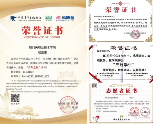 程正东身为学院信息工程系的一名系部团总支部书记,在校表现优异,学努力刻苦,积极配合老师的工作,学习成绩名列前茅,多次排名班级第一,获得学院“三好学生”称号。积极主动参加各种校园及班级活动,同时自己也抓紧课外每一分每一秒学习的机会,参与各类比赛,均取得不错的成绩。2022年11月参加“送你一朵小红花”致敬一线英雄全国高校青年志愿者招募活动,荣获“小红花青年志愿者”荣誉称号;2023年1月参加“庆祝澳门回归祖国23周年”全国青年志愿宣传活动,荣获“青年之星”荣誉称号;2023年5月参加自治区职业院校技能大赛获得高职学生组嵌入式技能大赛团体赛二等奖。