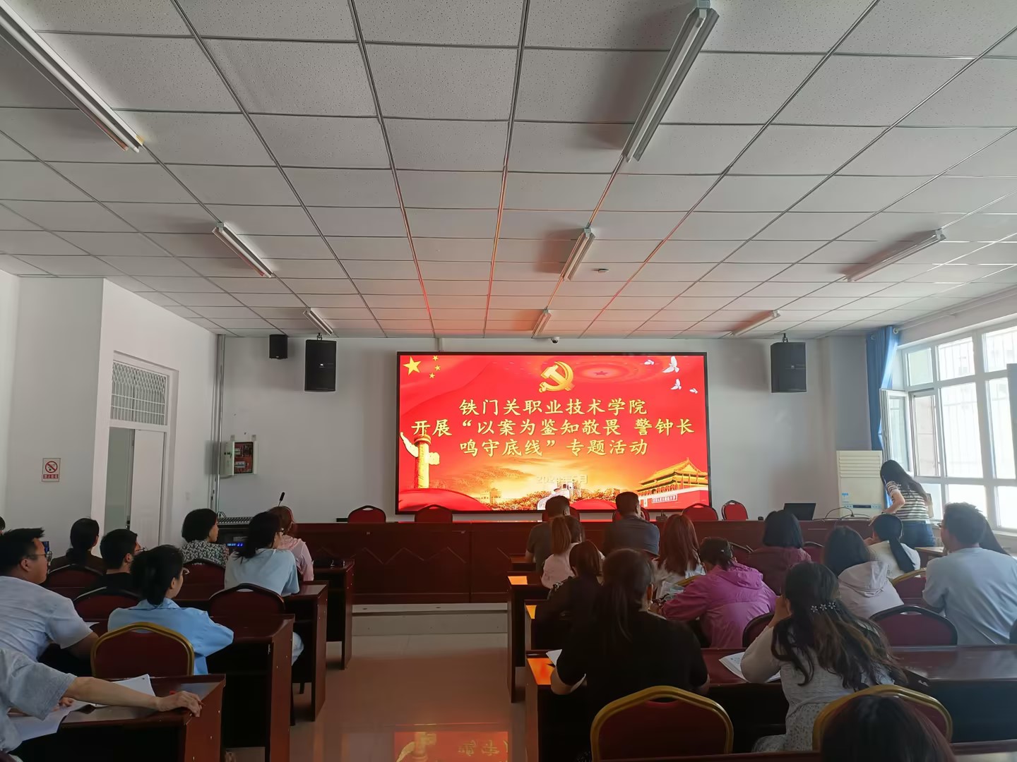 为深入学习贯彻习近平总书记关于全面从严治党的重要论述,坚持党对职业教育事业的全面领导,5月10日下午,beat365官方网站在库尔勒校区召开“以案为鉴知敬畏、警钟长鸣守底线”主题警示教育专题活动,库尔勒校区全体教职工参加会议。