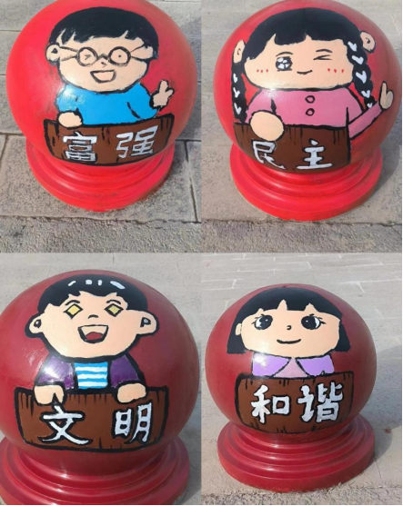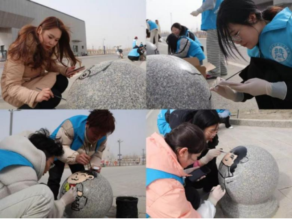 在铁门关校区教育艺术系学生志愿者们也忙得不亦乐乎,在美化校园志愿服务中,他们围绕“社会主义核心价值观”为学院门口的石墩绘制了精美的图案,给石墩穿上“新衣”。大家分工明确,热情满满。有的负责补色,有的负责作画构图,有的负责调色,五彩斑斓的颜料在灵巧的双手间生成一幅幅可爱的画作。通过给石墩彩绘,让校园焕发新的生机。