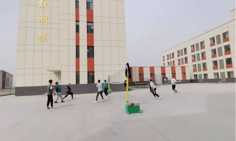 在排球场上,现代农牧系21级畜禽养殖1班和21级农业经济管理1班正在举行排球友谊赛,比赛丰富了疫情下同学们的课余生活。