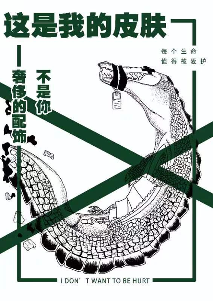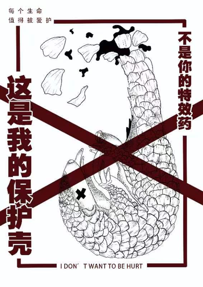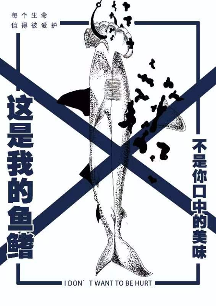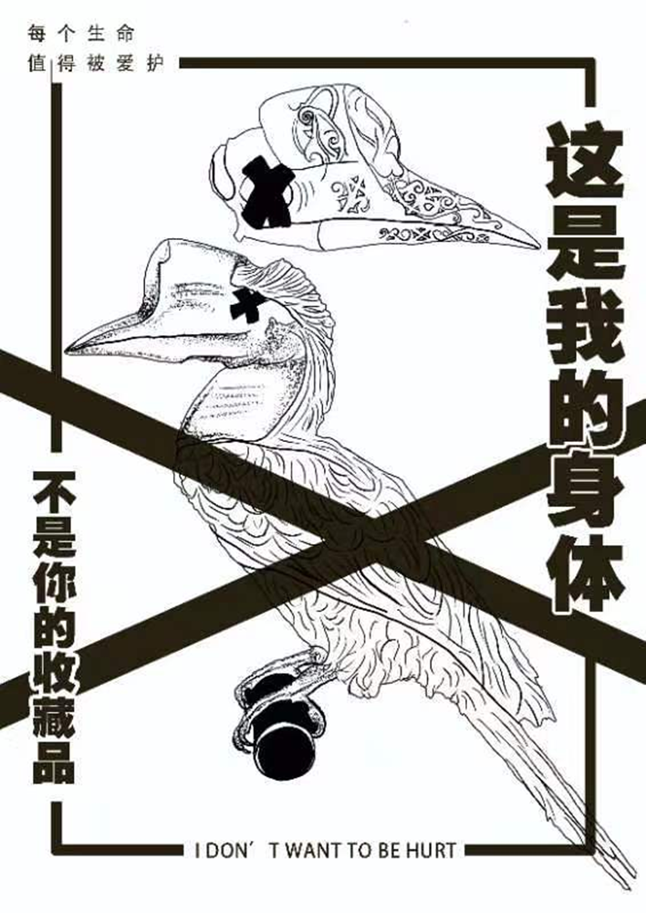 作品以“犀牛”“鳄鱼”“穿山甲”“盔犀鸟”“鲨鱼”五种野生动物为原型,通过黑白线条勾勒画面主体,结合动物拟人化的自白,给人以触目惊心的视觉体验,使人更真切地体会到动物面对死亡的恐惧和无助,感受到生命的脆弱和偷猎者的残忍,抽象表达了“每个生命值得被爱护”的中心思想。
