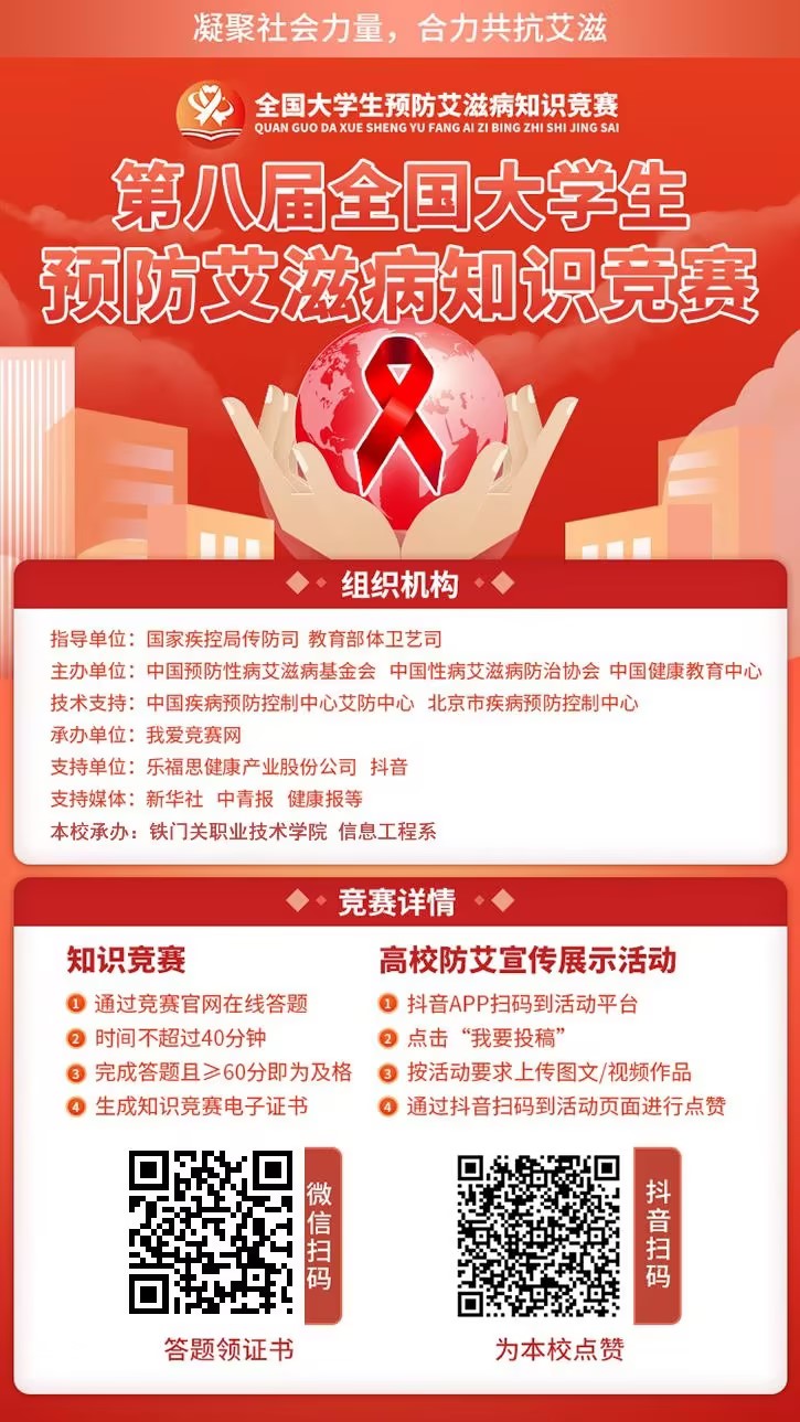 为贯彻落实《艾滋病防治条例》,宣传普及艾滋病防治知识,为进一步加强学生对艾滋病的认识和了解,增强自我保护意识,11月18日至30日,beat365官方网站信息工程系组织全体学生通过线上线下相结合的方式,参加了第八届全国大学生预防艾滋病知识竞赛活动。