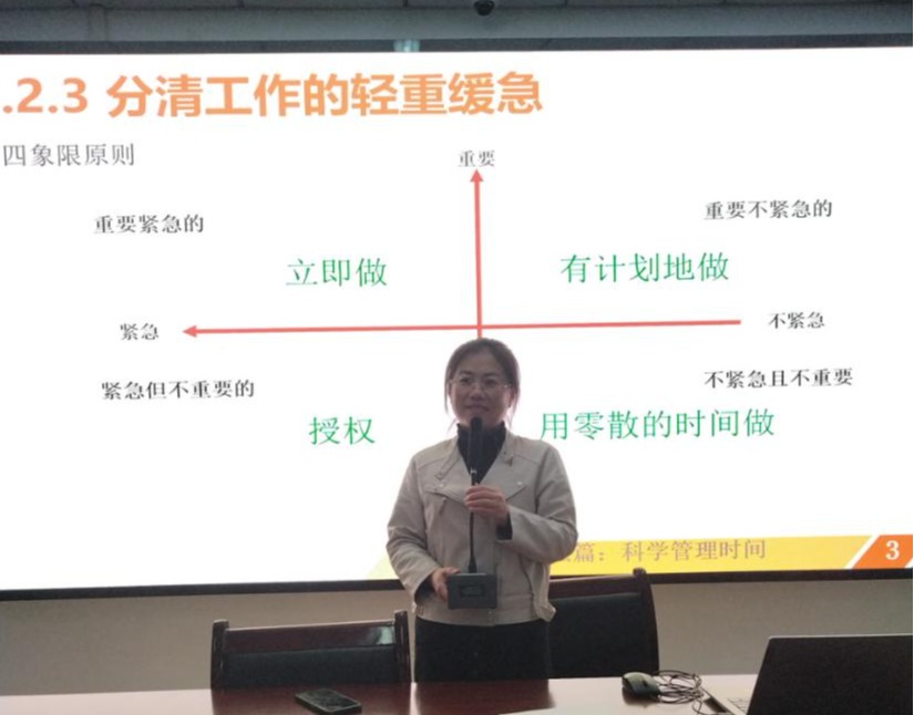 接下来,心理老师围绕什么是时间管理、为什么进行时间管理以及如何进行科学时间管理3个方面与学生展开交流。当被问及“时间都去哪了?”同学们踊跃回答,列举了一整天需要完成的任务清单,心理老师根据学生创设的情境,通过深度剖析时间管理的“四象限”法则,引导学生按照事情的轻重缓急科学合理的规划自己时间,有效化解时间安排上“忙”“盲”“茫”的困惑。