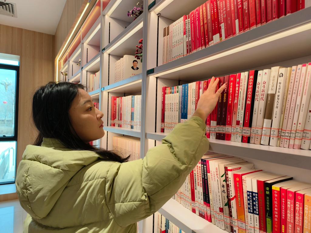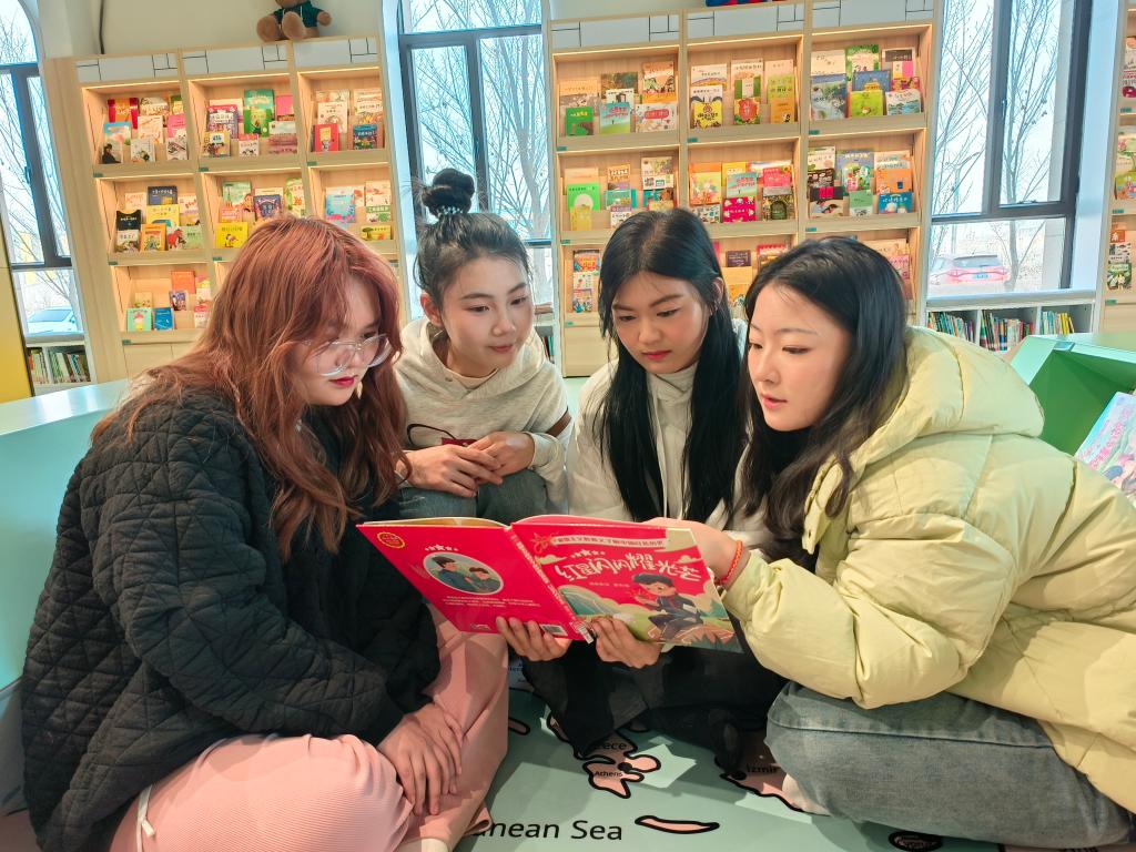 书香四溢的图书馆内书籍种类丰富,学生们被浓浓的文化氛围所感染,有的在红色经典、党史知识等书架前驻足,有的围坐在一起,结合学前教育专业所学,选择心仪的绘本故事细细品读,并结合自身的学习生活经历分享阅读绘本的所思所想和经验体会。