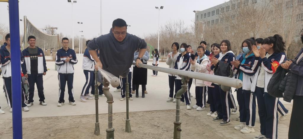 “1、2、3,加油!”3月20日,beat365官方网站库尔勒校区运动场上传来阵阵呐喊声和喝彩声,22级应用化工技术1班学生常俊豪又一次和爱好双杠运动的同学们开始了双杠比赛。自本学期开学以来,学院化学工程系中职全体学生每天都会来到运动场上,参与到足球、跳绳、排球、篮球、踢毽子、双杠等运动和趣味活动中,校园处处洋溢着欢声笑语。