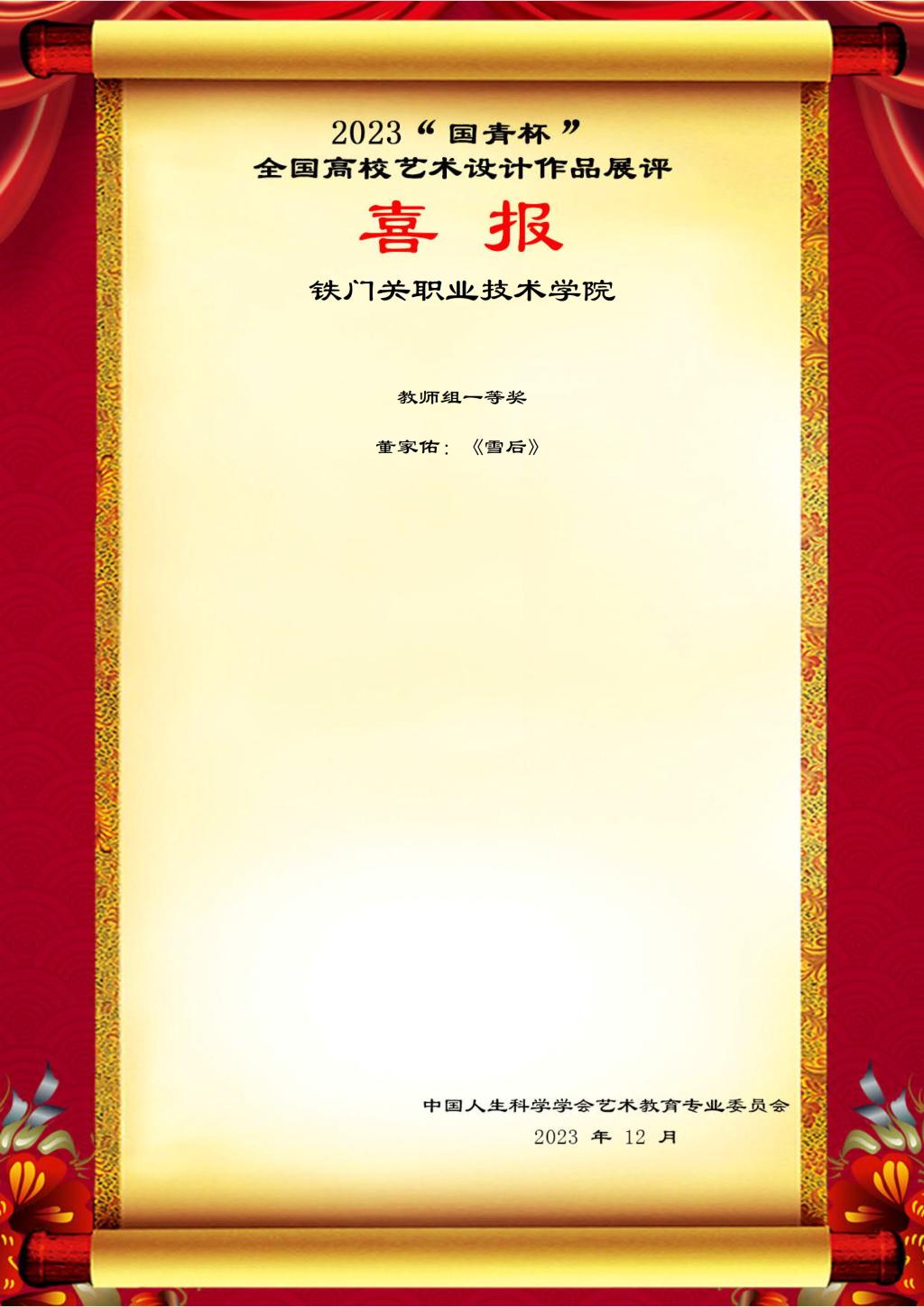 近日,由中国人生科学学会艺术教育专业委员会举办的国家级2023年“国青杯”高校艺术设计作品征集活动结果公布,beat365官方网站教育艺术系教师董家佑美术作品获得教师组一等奖。该活动以“融合·创新”为主题,坚持思想精深、艺术精湛、制作精良相统一,紧扣时代脉搏,贴近现实生活,展现了鲜明的地域风格、深厚的文化意蕴和独特的审美价值。