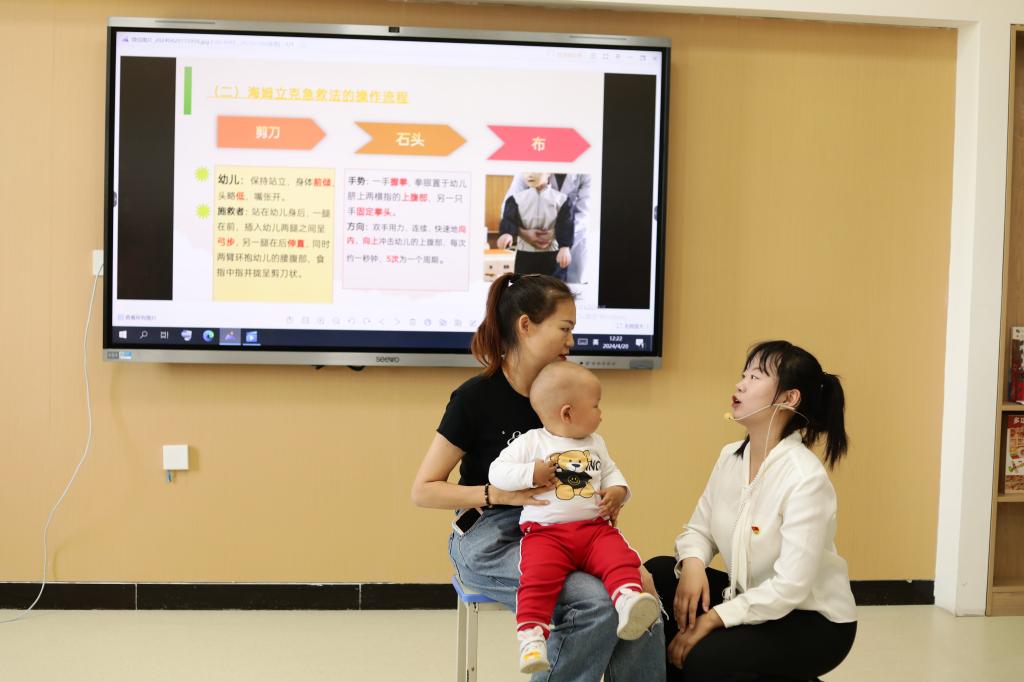 最后,教育艺术系教师杨舒程为各位家长讲解了幼儿气管异物阻塞时的应急处理方法,结合视频科普了海姆立克急救法的两种情形,针对0-1岁婴儿可采用背部拍击法和胸部冲击法,针对1岁以上的儿童可以采用“剪刀石头布”口诀,并用模拟娃娃进行演示,演示后让部分家长上台实践,杨老师有针对性地为其提供指导,家长们纷纷表示这个技能非常实用。