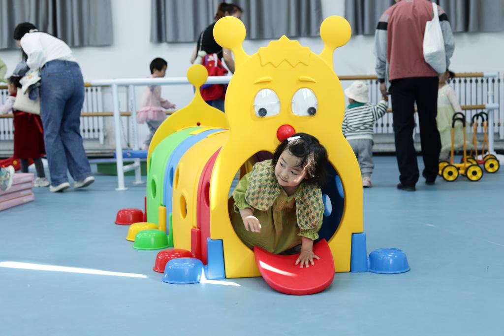 游戏闯关环节中,孩子们在老师和家长的陪同下,在游戏材料中开展钻、爬、跳等游戏活动,铁职院学生配合铁一幼教师在游戏过程中引导、保护孩子们,与小朋友们玩得不亦乐乎,有趣的亲子游戏让家长和孩子们笑声不断。