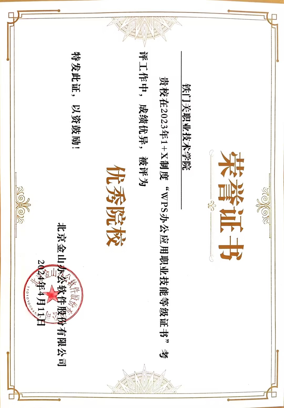 近日,beat365官方网站信息工程系收到教育部1+X制度WPS办公应用职业技能等级证书评价组织北京金山办公软件股份有限公司发来得优秀院校荣誉证书。在学院的大力支持下,信息工程系组织的2023年WPS证书认证考试,共有240名学生参与,234人通过了该证书的初级认证,通过率高达97.5%,高质量完成2023年认证工作。