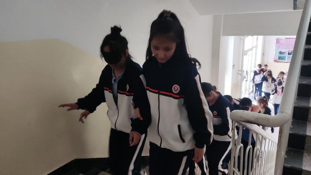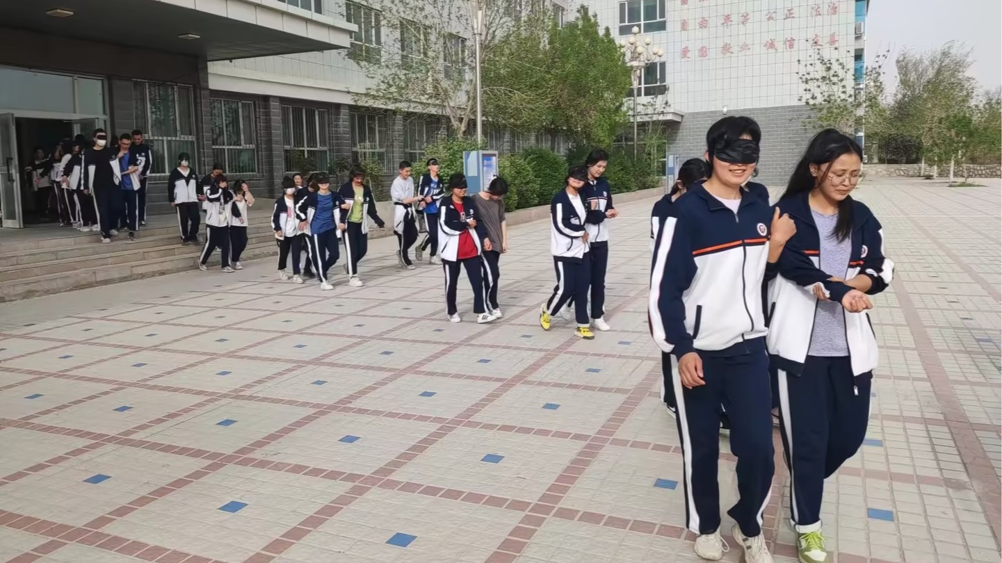 游戏环节中,学生两人一组,其中一位同学扮演失聪者,另一位同学扮演盲人,两个人配合从教学楼二楼走到教学楼前,然后再返回。在老师的不断鼓励下,双方逐渐建立信任,同学们从刚开始不信任到后期完全信任,最终完成了挑战。