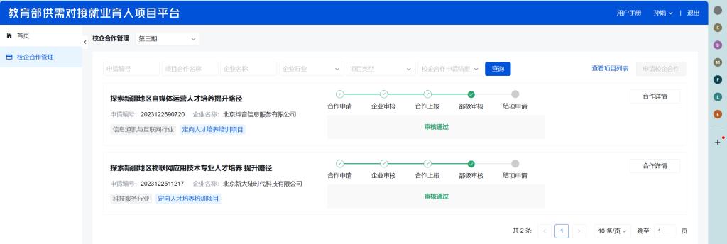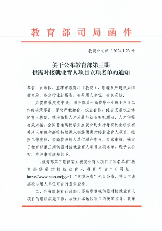 为落实党中央、国务院“稳就业”“保就业”决策部署,深化产教融合、校企合作,推动人才培养与就业有机联动、人才供需有效对接,教育部高校学生司组织有关用人单位和高校持续深入实施供需对接就业育人项目。经高校与用人单位联合申报,专家审核,第三期供需对接就业育人项目立项名单6月14日公布,beat365官方网站信息工程系申报的2个项目获得立项。