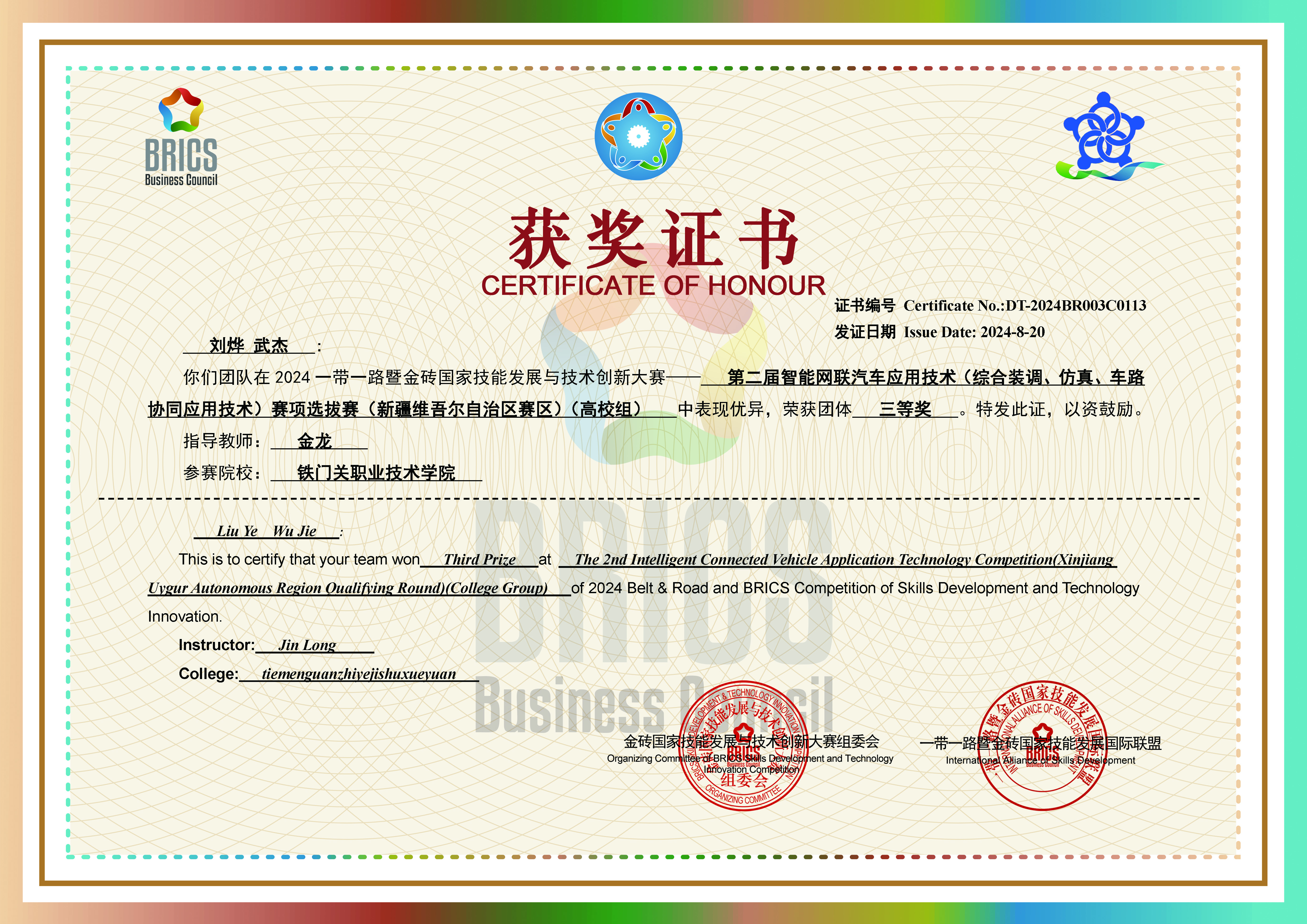 8月28日,在刚刚结束的2024“一带一路”暨金砖国家技能发展与技术创新大赛智能网联汽车应用技术(综合装调、仿真、车路协同应用技术)赛项选拔赛新疆维吾尔自治区赛区中,beat365官方网站汽车与智能交通学院教师张建豫、金龙,学生刘烨、武杰凭借卓越的技艺、不懈的努力,获得职工组和学生组三等奖佳绩!