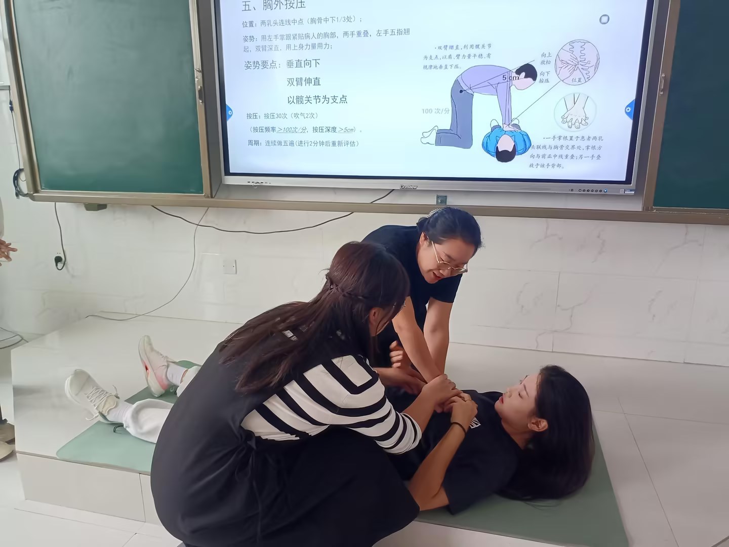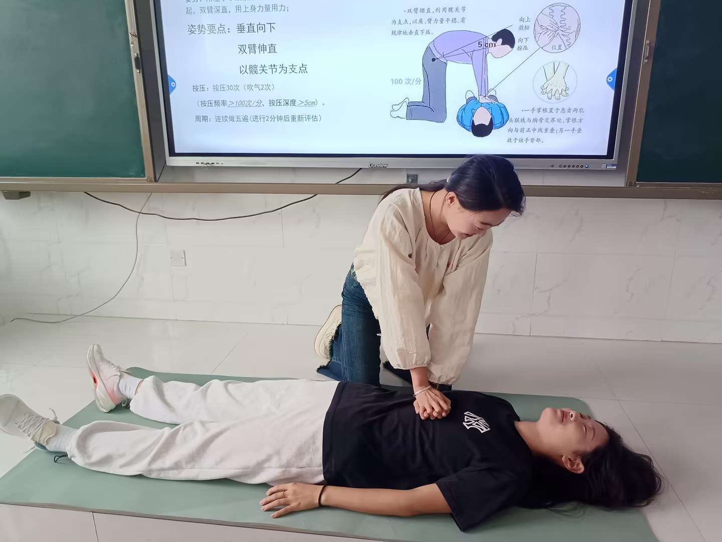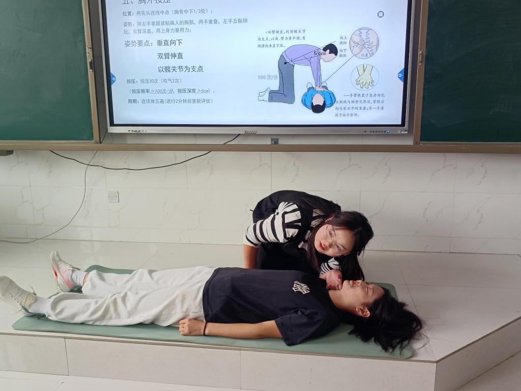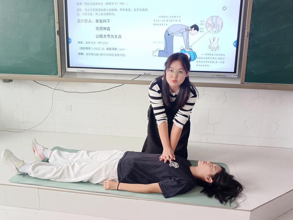 在模拟实操环节中,老师们踊跃参加,按照讲解过的流程和动作,认真操练,有效地将理论内容融入到实际操作中,切实提高了培训效果。实操环节中王晓蓓老师扮演一名失去意识昏倒在路边的居民,侯莉老师及衡怡欣老师扮演红十字救护员,在确保周围安全的情况下对其进行心肺复苏救援。