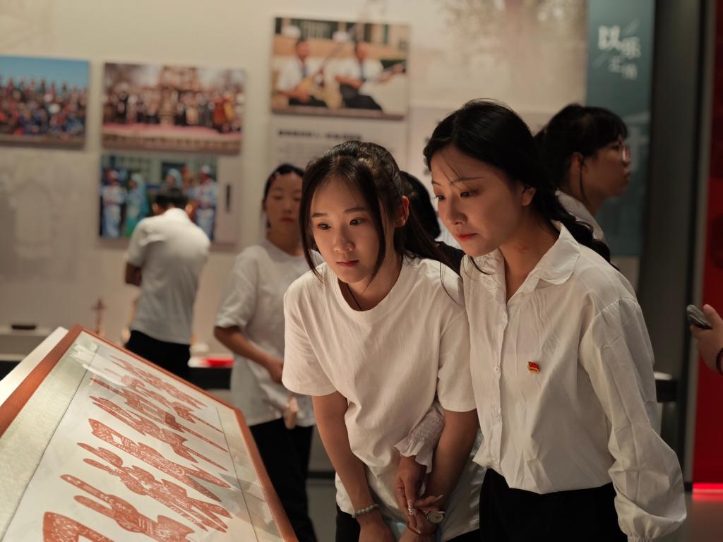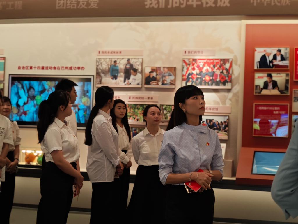 在讲解员的引导和讲解下,以铸牢中华民族共同体意识为主线,沿着巴州各民族交往、交流、交融的历史脉络,大家依次参观了“共筑家园”“共同奋斗”“共创繁荣”“共圆梦想”四个篇章主题展,通过图片展示、视频展播、互动体验等展陈方式,领略了巴州民族团结进步事业发展的宏伟篇章。