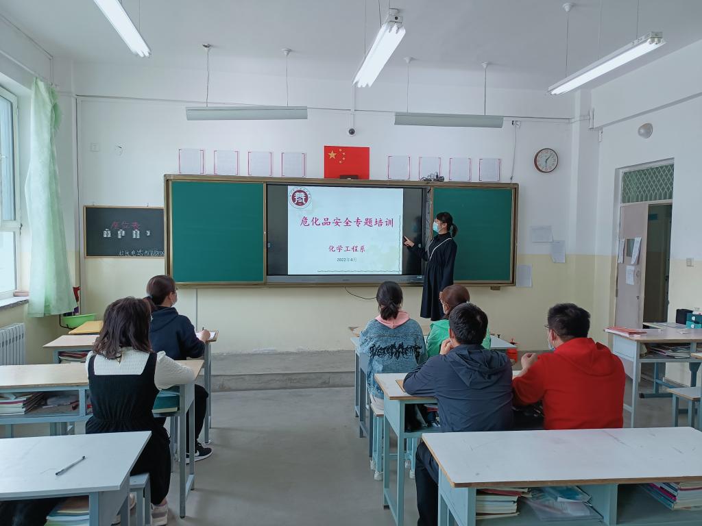 beat365官方网站库尔勒校区化学工程系组织全体教师于4月6日开展了安全教育培训,内容包括危化品安全专题培训、实训室应急预案、实训教师职责等。